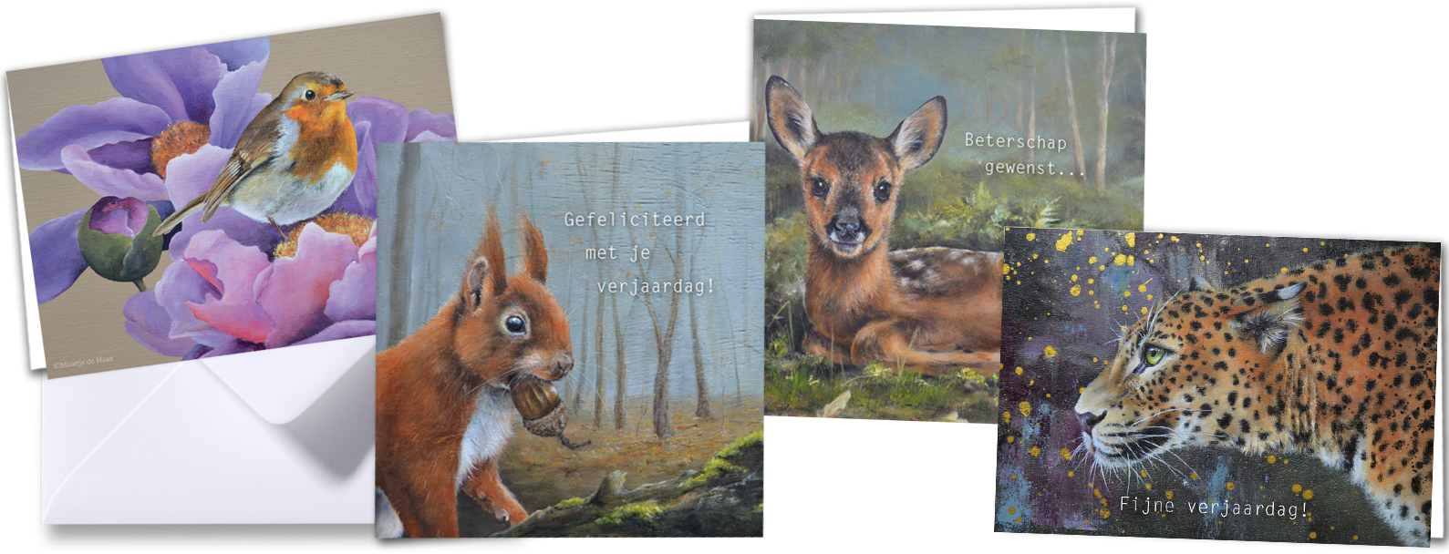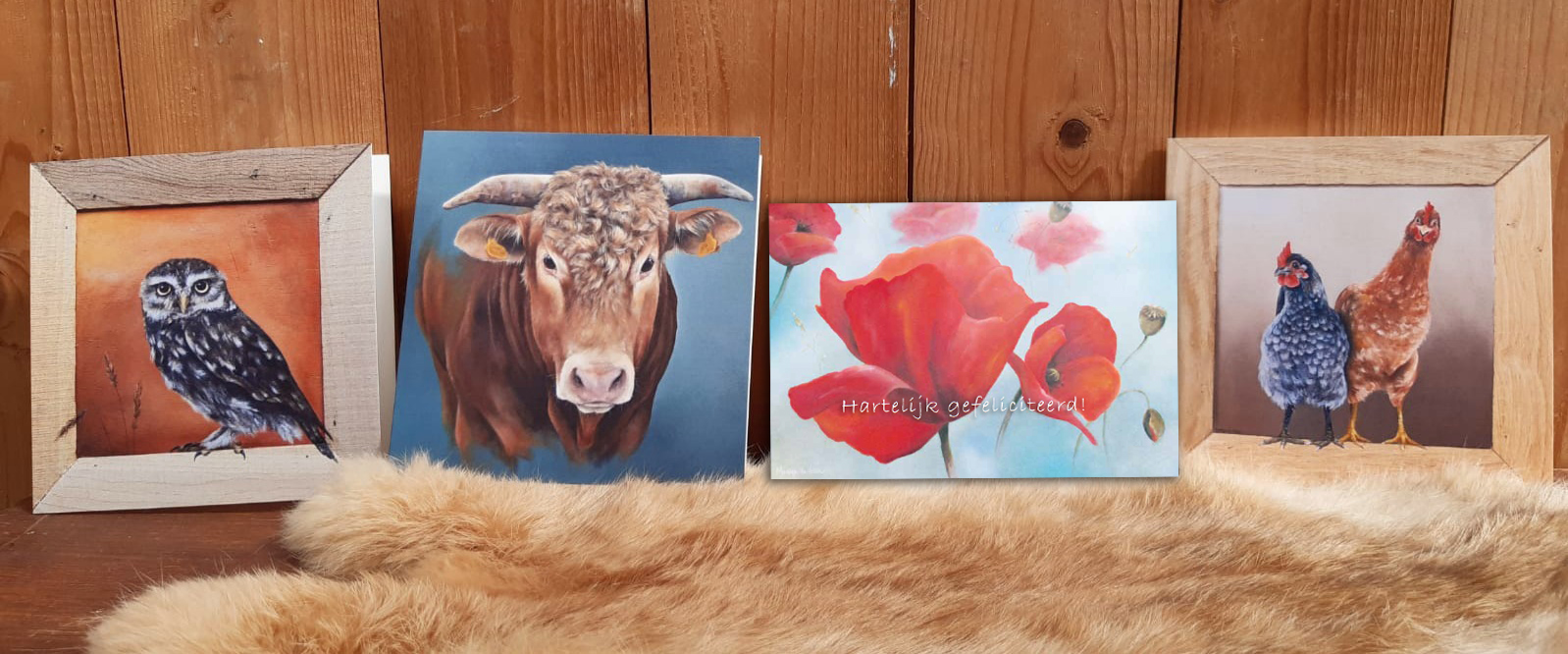In het schilderatelier staat een kaartenmolen gevuld met mijn kunstkaarten; van de originele werken/schilderijen heb ik kaarten laten drukken. In totaal staan er nu 25 verschillende kaarten met blanco binnenzijde. Er zijn twee verschillende modellen/formaten, afhankelijk van de afbeelding; 13 x 13 cm en 10,5 x 14,8 cm.