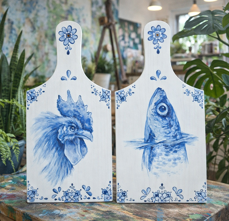 De plankjes heb ik dan al voorbehandeld met gesso, zodat je kunt starten met tekenen. Zodra jouw schets erop staat, ga je met acrylverf aan de slag. De Delfts Blauwe versiering aan de rand mag je uiteraard ook zelf kiezen/verzinnen, er zijn voorbeelden in het atelier aanwezig.